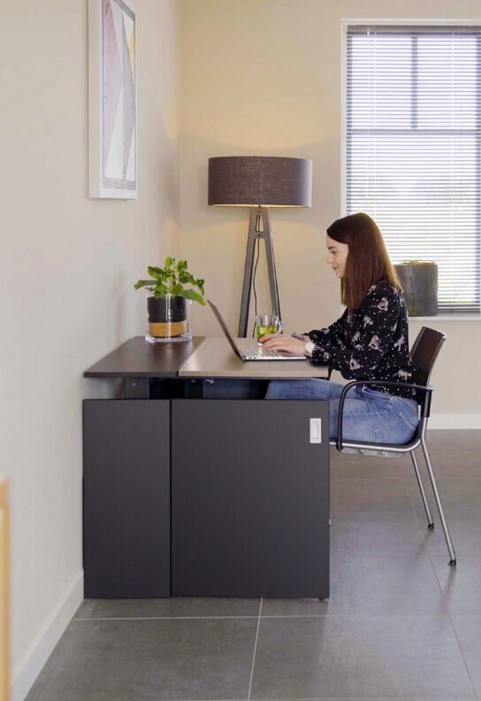 A sit-stand desk the size of a shoe cabinet? The HomeFit is a perfect fit for you! The HomeFit is a sit-stand desk and cabinet in one. This way you can work in your living room and when the working day is finished, you can neatly store your workplace again. This compact home office desk is available in many trendy color combinations and is delivered fully assembled.